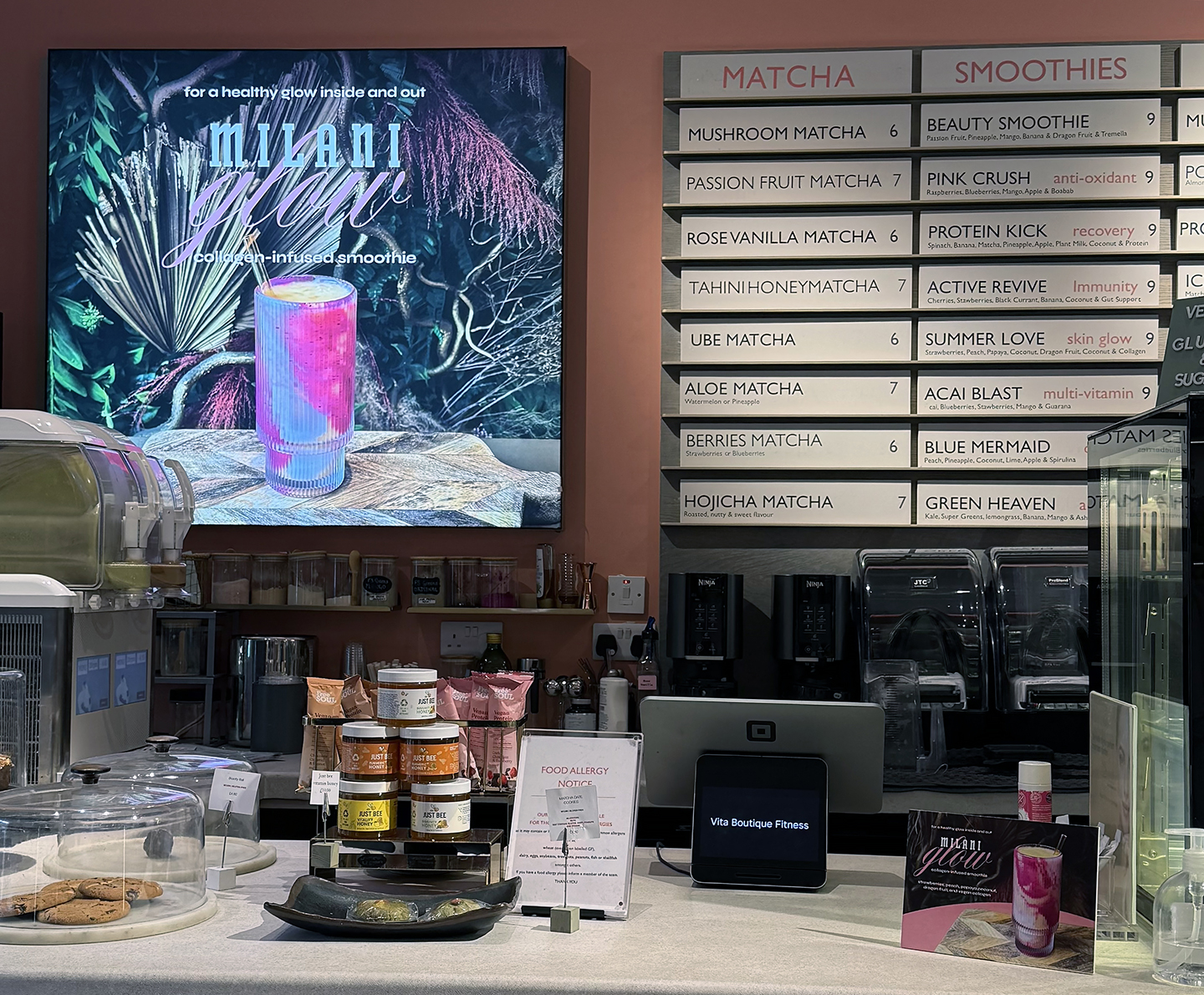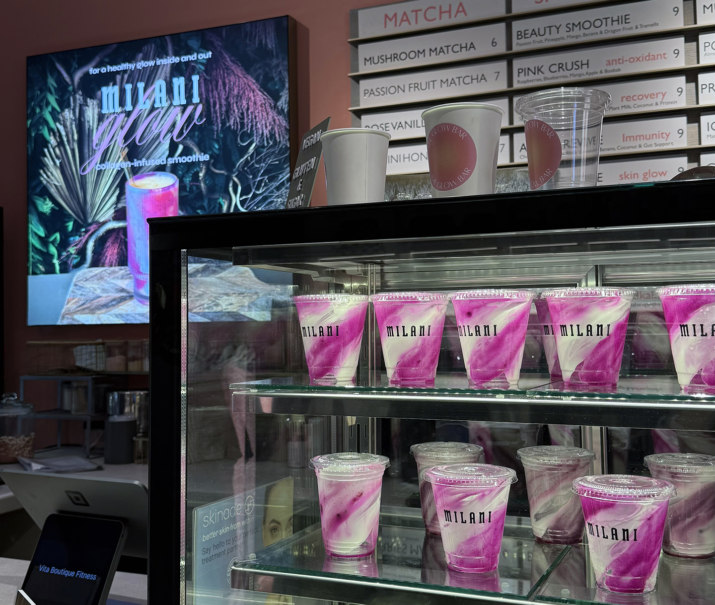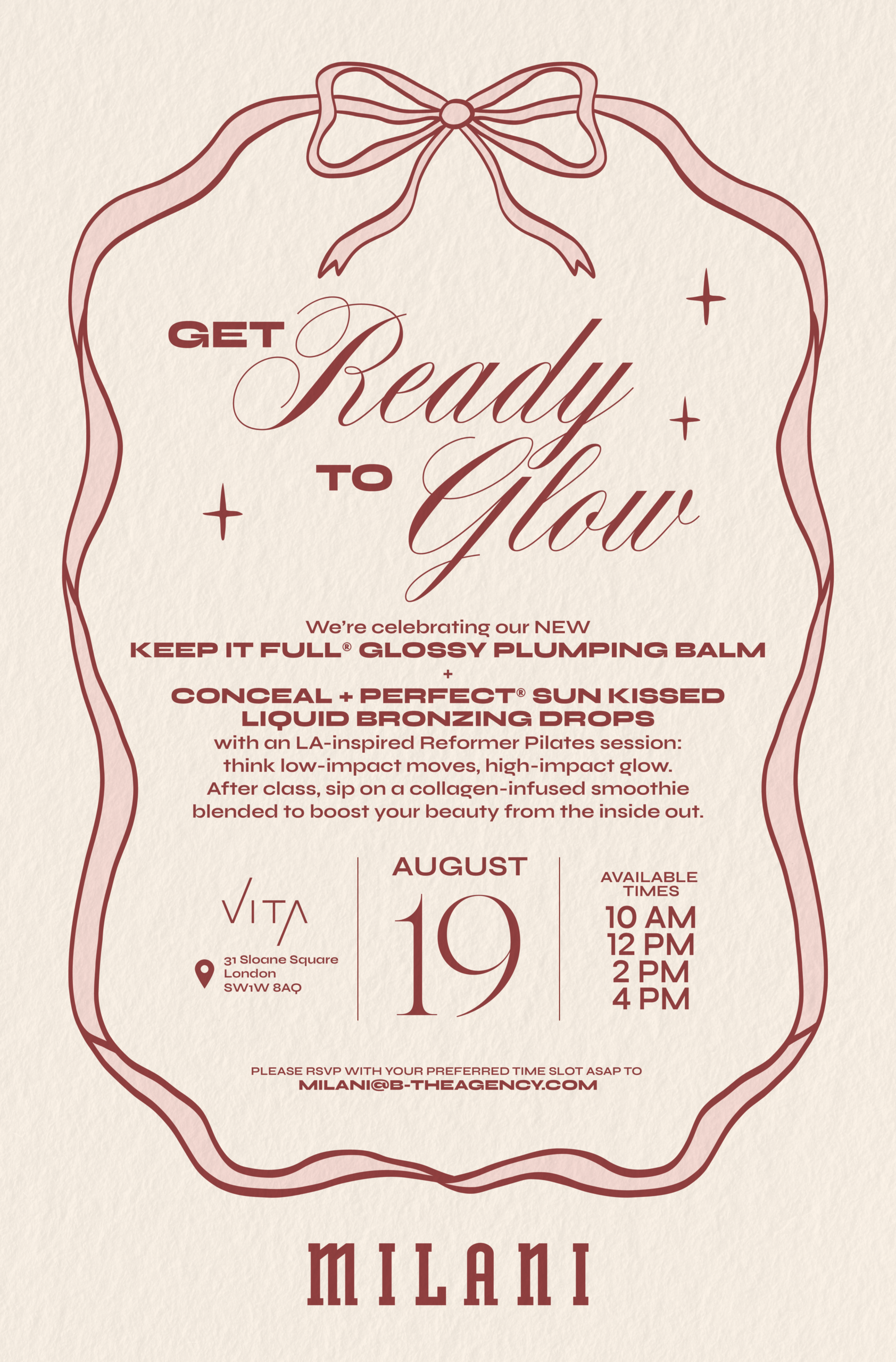 I designed an intimate popup to mark the UK launch of Conceal + Perfect Sunkissed Liquid Bronzing Drops and the Keep It Full Glossy Plumping Balm for Milani Cosmetics. To celebrate the cult-favorite LA-based beauty brand bringing glowy complexion and glossy plumped pouts to the UK, Milani Cosmetics took over a chic West London fitness studio to host branded pilates classes followed by skin-boosting smoothies and product education. All collateral pieces, wayfinding, and environmental graphics designed by me. Staffing and PR guest list courtesy of b the agency.